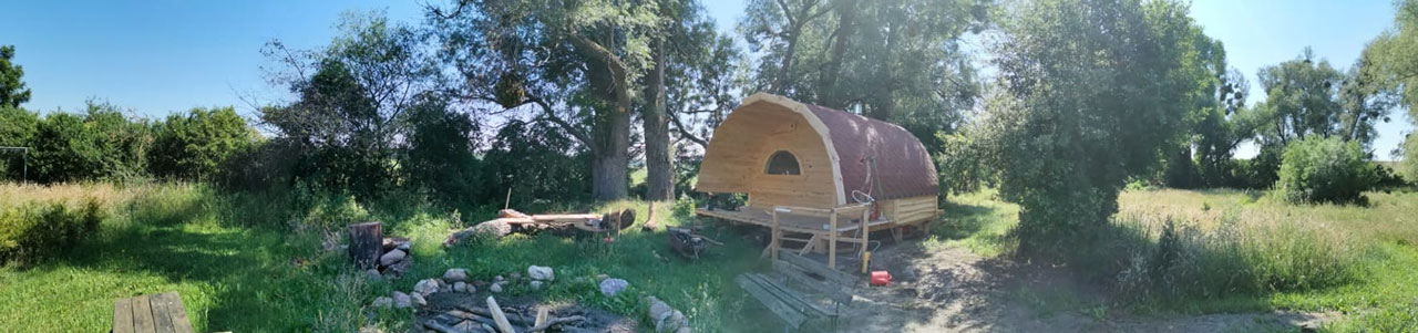 - Vollholz Sauna im Hobbit-Haus Stil mit kleiner Terrasse, Aussendusche und Holzofen